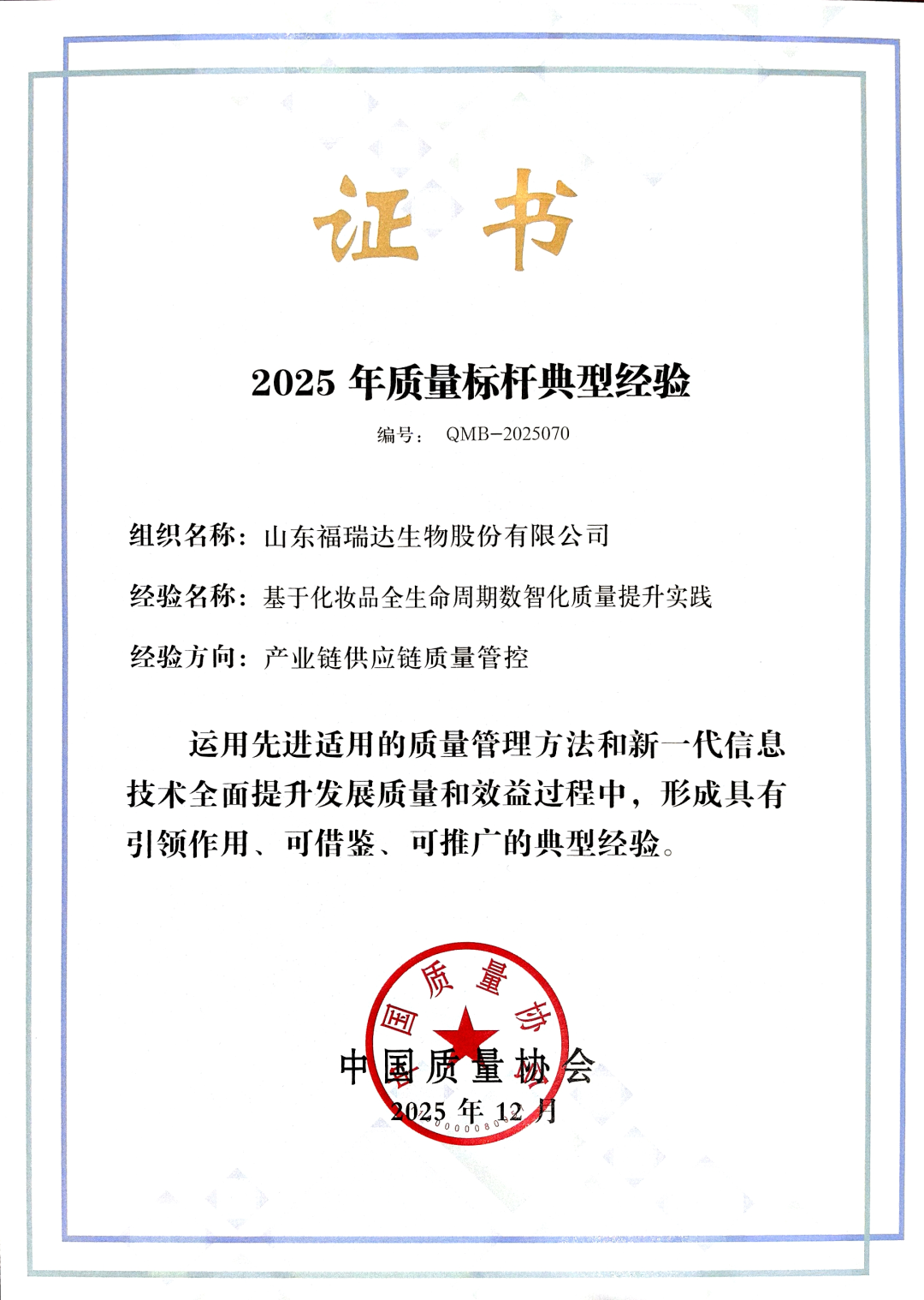 近日,中國(guó)質(zhì)量協(xié)會(huì)正式公布2025年全國(guó)質(zhì)量標(biāo)桿典型經(jīng)驗(yàn)征集結(jié)果,山東福瑞達(dá)生物股份有限公司憑借“基于化妝品全生命周期數(shù)智化質(zhì)量提升實(shí)踐”成功入選,這一榮譽(yù)不僅是對(duì)公司質(zhì)量管理創(chuàng)新實(shí)踐的高度肯定,更標(biāo)志著福瑞達(dá)生物股份在質(zhì)量管理、智能制造領(lǐng)域的探索獲得國(guó)家級(jí)權(quán)威認(rèn)可。