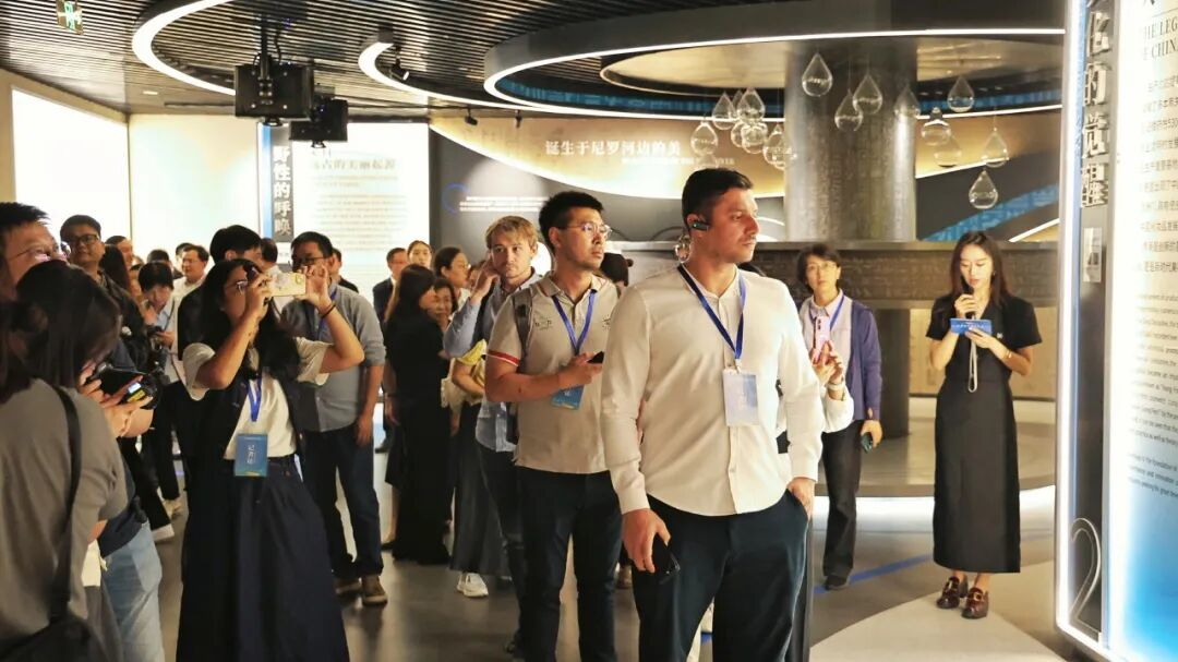 采訪團首先來到福瑞達世界美妝科技館參觀。這是國內首個美妝主題科技館,于2024年8月啟用。展廳以世界美妝發展史介紹為起點,共有五個展陳單元,通過詳實的文獻記載、復刻文物、AI變妝、互動體驗、科技展示、元宇宙暢想等,全面展示世界美妝文化及科技發展的獨特魅力。